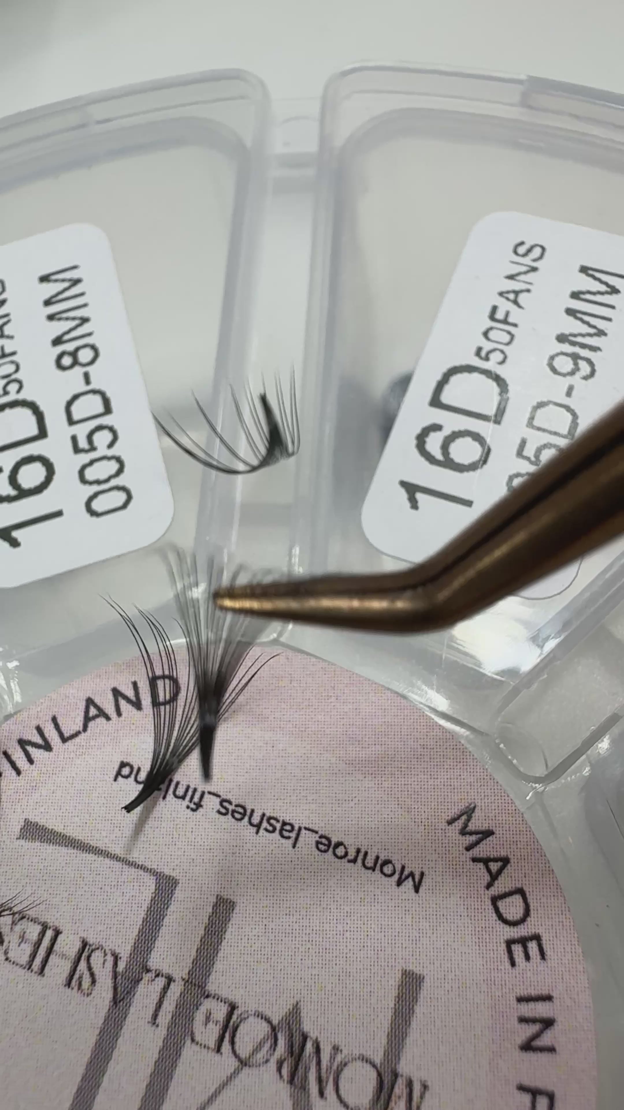 Erittäin laadukkaat valmiskuidut kapealla tyvellä. Symmetriset kuidut takaavat täydellisen lopputuloksen. Valmiskuidut liimautuvat täydellisesti luonnonripselle. Viuhkat säilyttävät muotonsa kauniina ja avoimina. 16D viuhka tarkoittaa, että viuhkassa on 16 kuitua. Määrästä huolimatta valmisviuhkat ovat kevyet ja turvalliset luonnon ripselle. Näillä viuhkoilla saat aikaa melko tuuhean lopputuloksen.