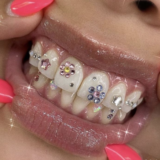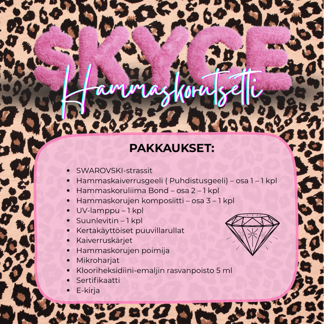 Pakkaukset sisältävät: SWAROVSKI-strassit, hammaskaiverrusgeeli (puhdistusgeeli) osa 1 (1 kpl), hammaskoruliima Bond osa 2 (1 kpl), hammaskorujen komposiitti osa 3 (1 kpl), UV-lamppu (1 kpl), suunlevitin (3 kpl), kertakäyttöisiä puuvillarullia, kaiverruskärkiä, hammaskorujen poimija, mikroharjoja, klooriheksidiini (emaljin rasvanpoisto) 5 ml, e-kirja